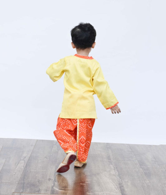 Yellow Kurta with Orange Bandhej Dhoti for Boys