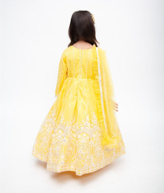 Yellow Net Embroidery Anarkali with Frill Dupat...