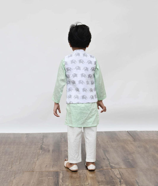 White Elephant Print Nehru Jacket with Green Ku...
