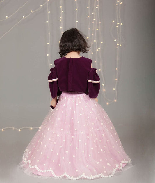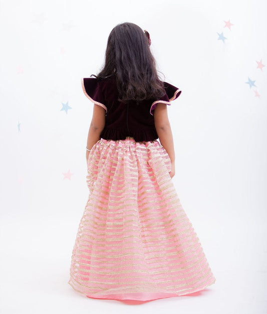 Burgundy Velvet Pink Gota Embroidery Lehenga wi...
