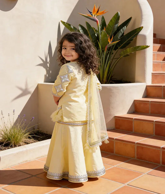 Yellow Print Anarkali and Chiffon Dupatta: A radiant yellow Anarkali adorned with delicate prints and paired with a soft chiffon dupatta. This outfit is perfect for little girls who love to twirl and dance around during the celebrations.