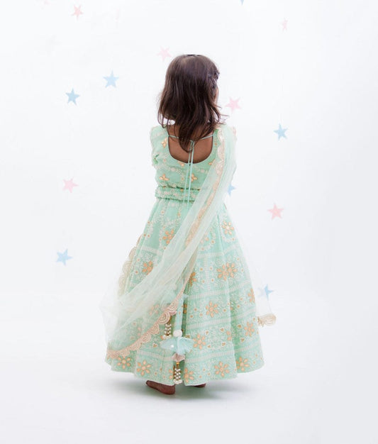 Green Lucknowi Anarkali with Net Dupatta for Girls