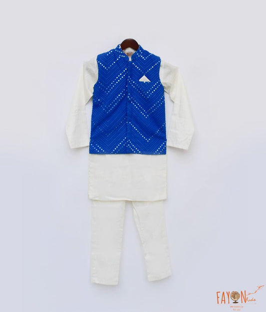Blue Embroidery Nehru Jacket Off White Kurta Pa...