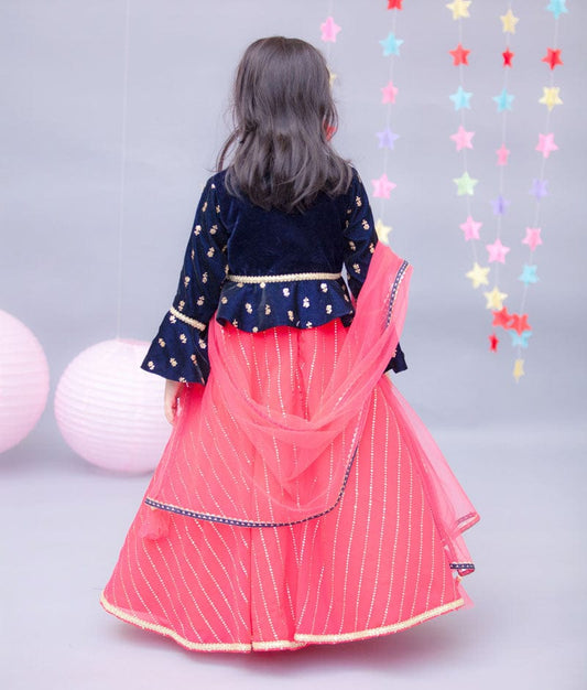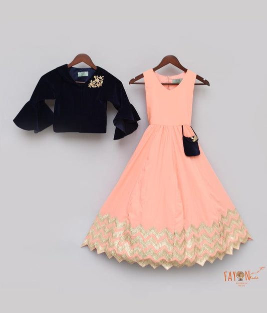 Peach Gota Dark Blue Velvet Jacket Anarkali for...