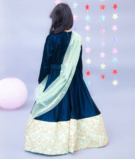 Teal Blue Velvet Anarkali with Boti Net Dupatta...