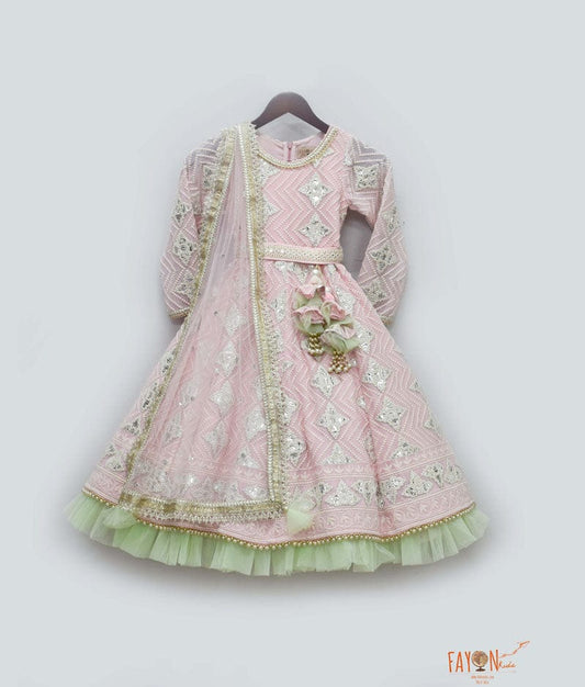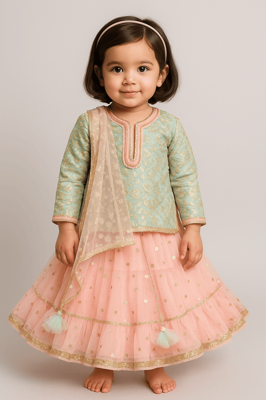 Our lehengas, including the “Pink Gota Green Net Frill Anarkali” and “Peach Brocade Choli with Lehenga,” are designed to make your little girl feel like a princess. Perfect for wedding kids ethnic wear girls, school functions, or festive photoshoots.