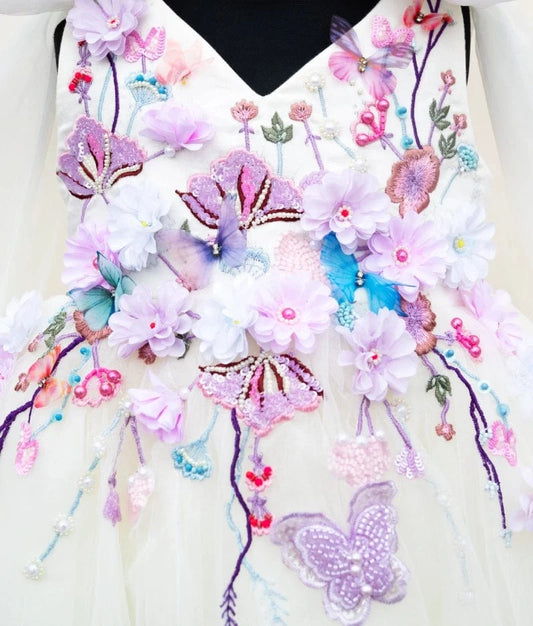 With delicate butterfly motifs and a soft lilac palette, this dress combines fantasy with finesse. A top pick for birthdays and evening parties.