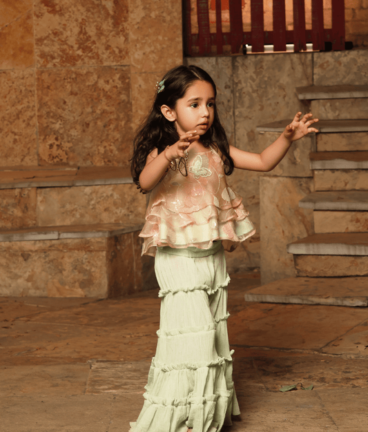Each sharara suit for girls is lovingly crafted with lightweight fabrics like organza, cotton, velvet, and net—ensuring that your little diva can dance, twirl, and celebrate without a worry. Our collection features festive must-haves like the Pink Embroidered Top with Sharara Set, the Gota Patti Glamour Black Sharara Set, and the Lilac Parsi Sharara Set, all of which are standout choices for weddings, birthdays, or festive gatherings.