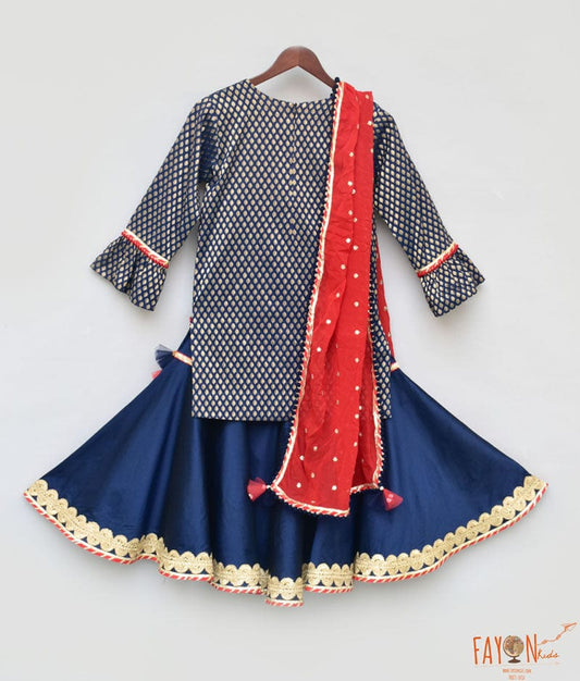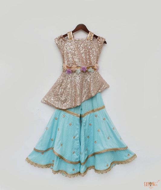 Blue Chanderi Kurti and Peach Net Sharara for G...