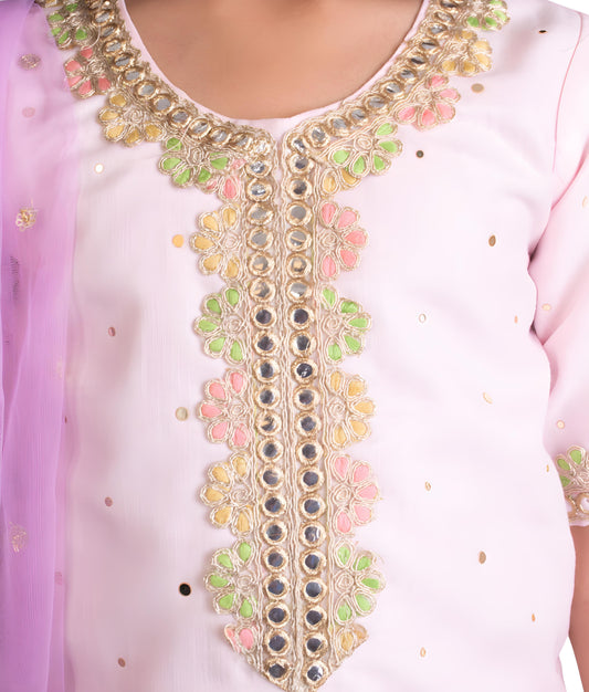 Pink Faux Mukaish Work Kurti Sharara Set for Girls