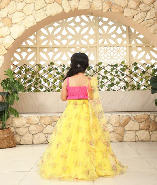 Yellow Tassel Choli with Printed Lehenga for Girls