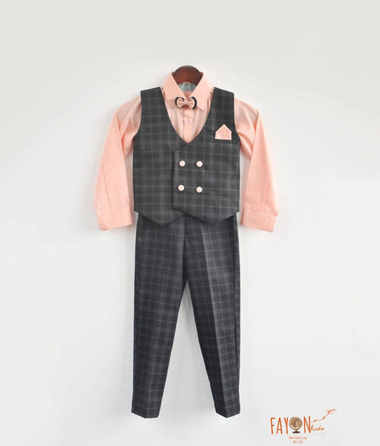 Dark Blue Check Waist Coat Set with Peach Shirt...