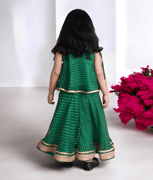 Bandhani, a tie-dye technique native to Rajasthan, is known for its vibrant colors and intricate patterns. Our Bandhani lehenga sets are crafted with rich fabrics and adorned with traditional embellishments such as gota patti, zari, and mirror work. These outfits are perfect for festive occasions, giving your child a cheerful and colorful appearance.