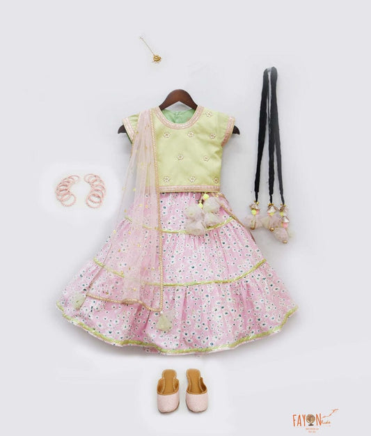 Green Choli with Pink Floral Lehenga Boti Net D...
