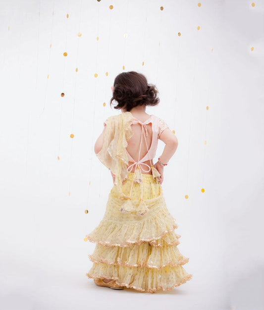 Peach Embroidery Yellow Chiffon Saree for Girls