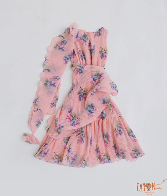 Peach Pleated Georgette Print Dress for Girls