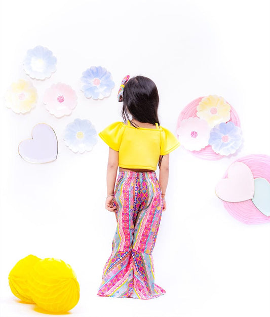 Yellow Lycra Crop Top with Printed Pant for Girls
