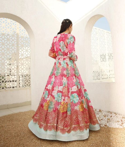 3D Flowers Choli and Pink Organza Layers Leheng...