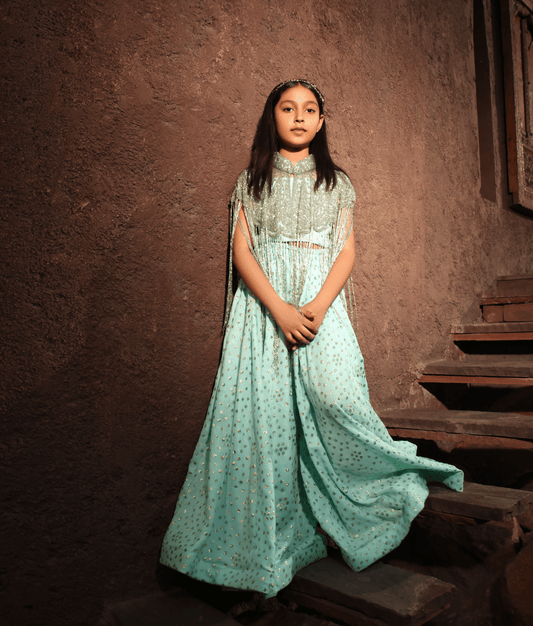 Aqua Blue Chanderi Sharara with Kurti for Girls
