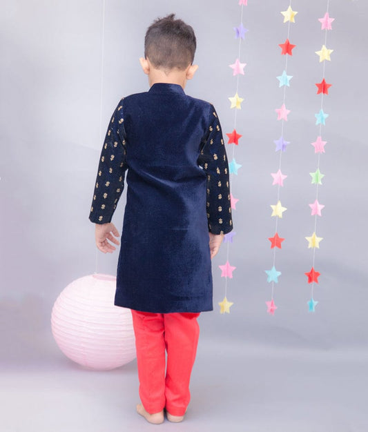 Navy Blue Velvet Embroidery Achkan with Pant fo...