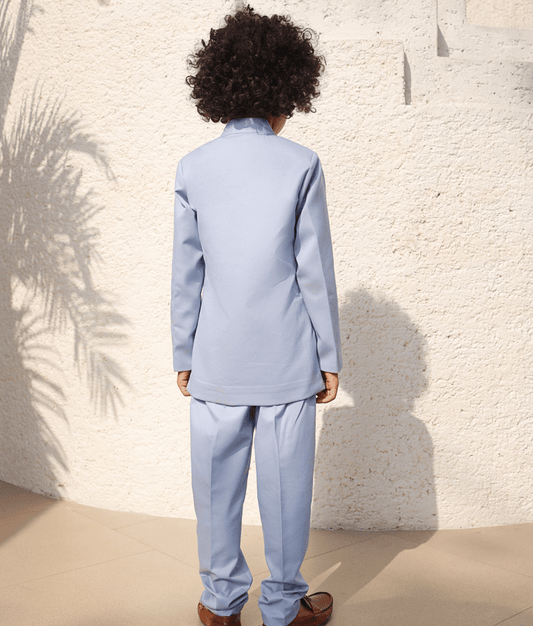 Blue Coat with White Shirt & Pants – Perfect for a sophisticated yet playful vibe.