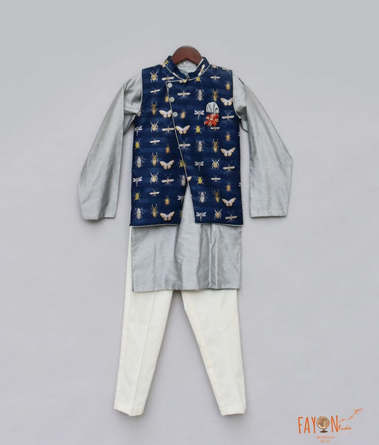 Blue Printed Nehru Jacket with Grey Kurta Pant ...