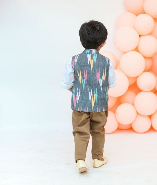 Ikat Print Nehru Jacket with Shirt Brown Pant f...