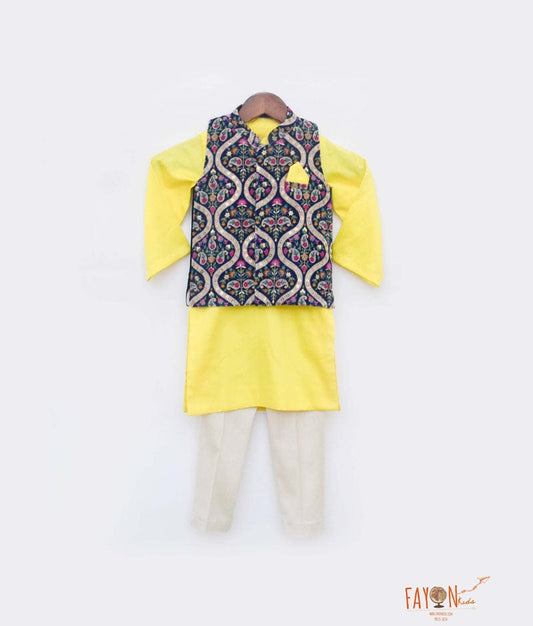 Blue Velvet Embroidery Jacket with Yellow Kurta...