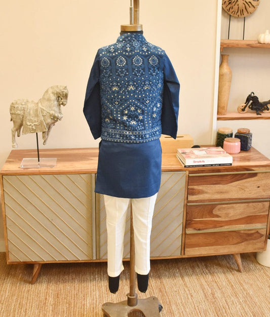 Regal Blue Ensemble: Boys Embroidered Nehru Jac...