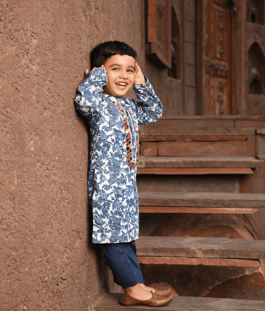 Blue Printed Kurta and Off White Pant for Boys