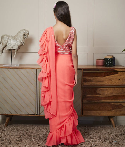 Embroidered Blouse with Coral Peach Stitched Sa...