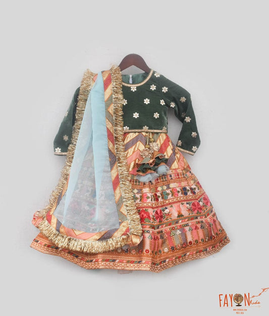 Green crinkle velvet lehenga choli for Girls