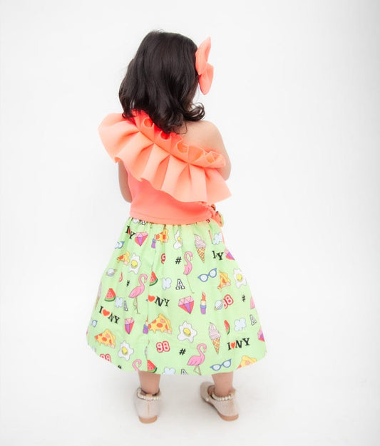 Peach Lycra Green Printed Crop Top with Skirt f...