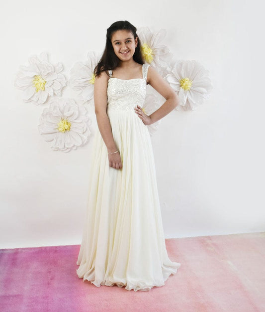 Bloom & Bow Off-White Gown – A summer-perfect piece with floral elegance.