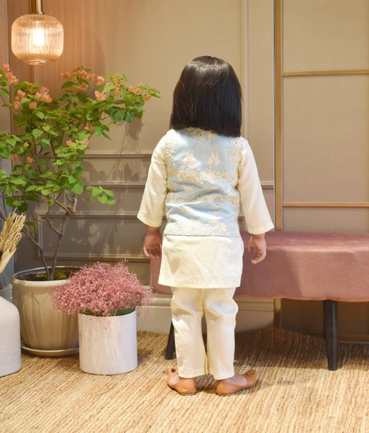 Off white Thread Embroidery Jacket and Blue Kur...