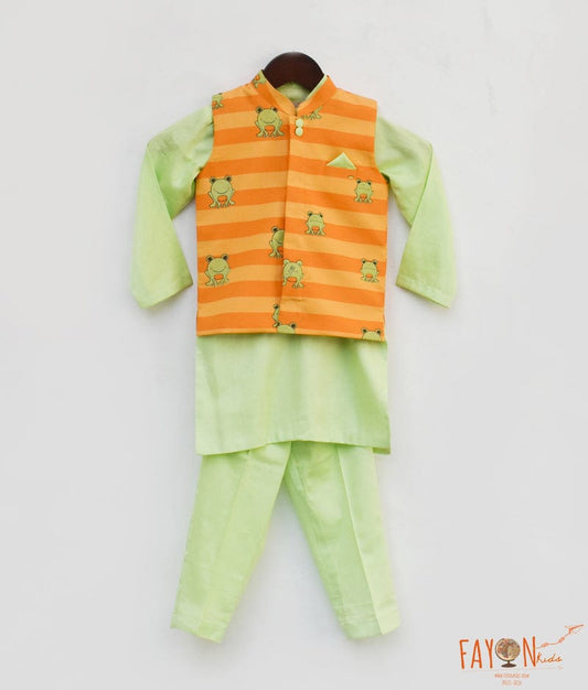 Orange Printed Nehru Jacket Green Kurta Pant fo...