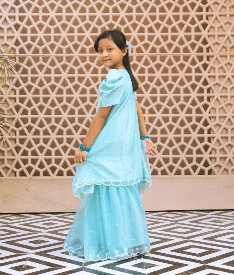 Elevate your little one’s festive look with this aqua embroidered organza Kurti Sharara set. Featuring exquisite Cut Dana embroidery, delicate lace finishing, and stylish pleated sleeves, this outfit is a true showstopper. Paired with an embroidered Sharara, it’s perfect for weddings, celebrations, and festive occasions!