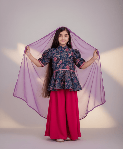 Elevate your little oneβs festive style with the Blue Velvet Printed Peplum Top and Palazzo set. The luxurious peplum top, crafted with soft lining, features a flattering V-neck, front hook-eye closure, and lace finishing for a refined touch. A delicate velvet bow on one side adds a playful element to the design. Paired with flowy velvet palazzos.