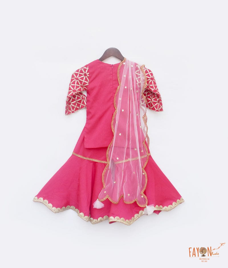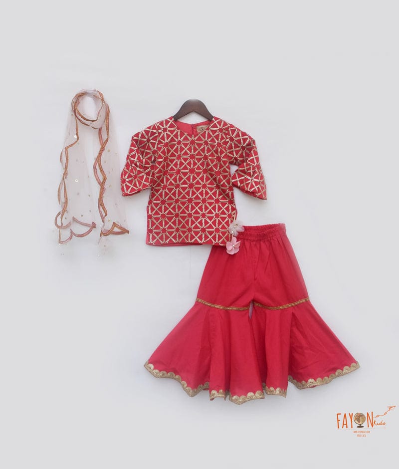 Coral Gota Embroidery Sharara with Kurti Boti Net Dupatta for Girls