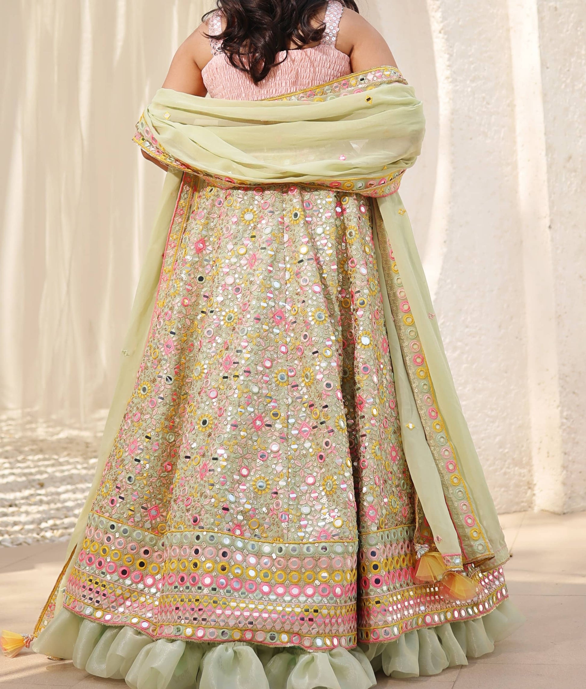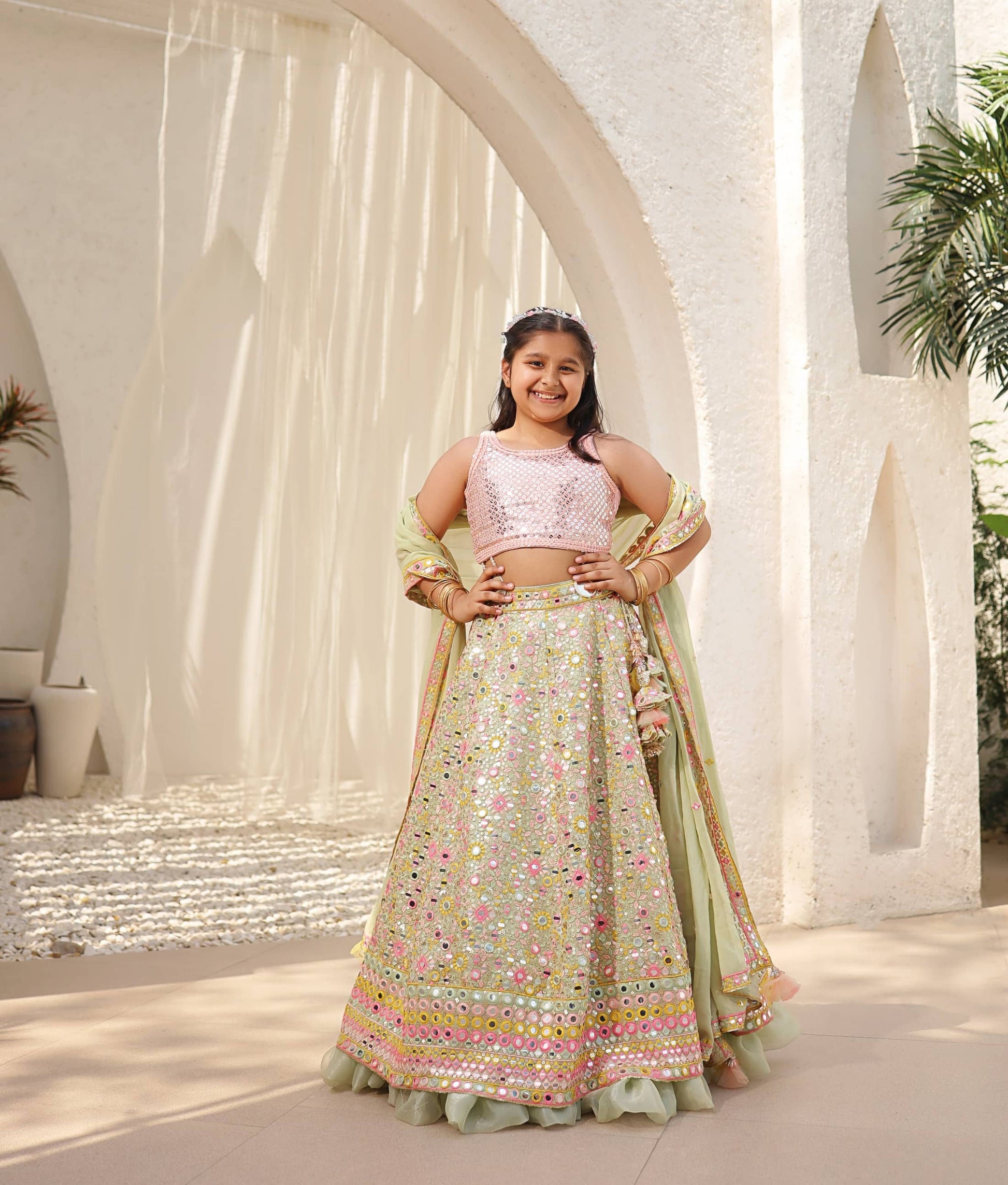 Transport your young princess to a world of elegance and charm with our Green Embroidered Lehenga Choli Set. The intricately embroidered choli, with a comfortable cotton lining and lace finishing, adds a touch of sophistication. Paired with the embroidered lehenga featuring soft lining and hand-made tassels at the waist, this ensemble exudes grace and style. The georgette embroidered dupatta, finished with tassels, completes the look with a hint of ethereal beauty. Perfect for weddings or festive celebrations, this set is a masterpiece of timeless elegance and impeccable craftsmanship. Styling Tip: Complete the enchanting look with traditional juttis or embellished sandals, intricate jewelry like kundan or pearl accessories, and a delicate maang tikka or hair accessory for a perfect wedding or special occasion attire that will make your little princess shine.