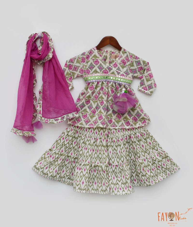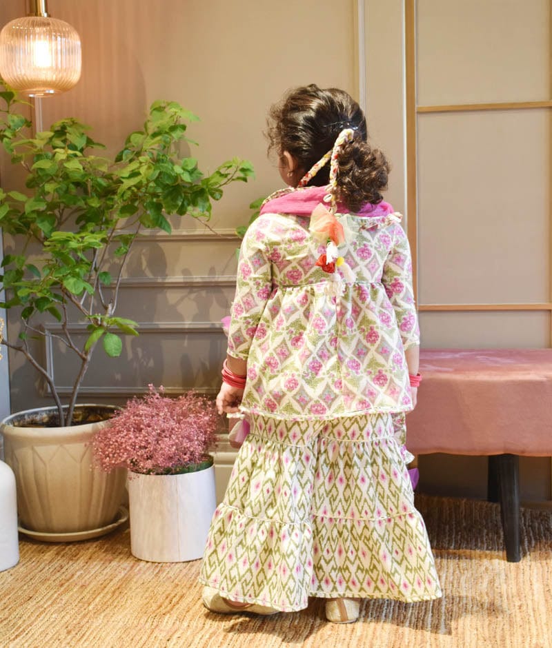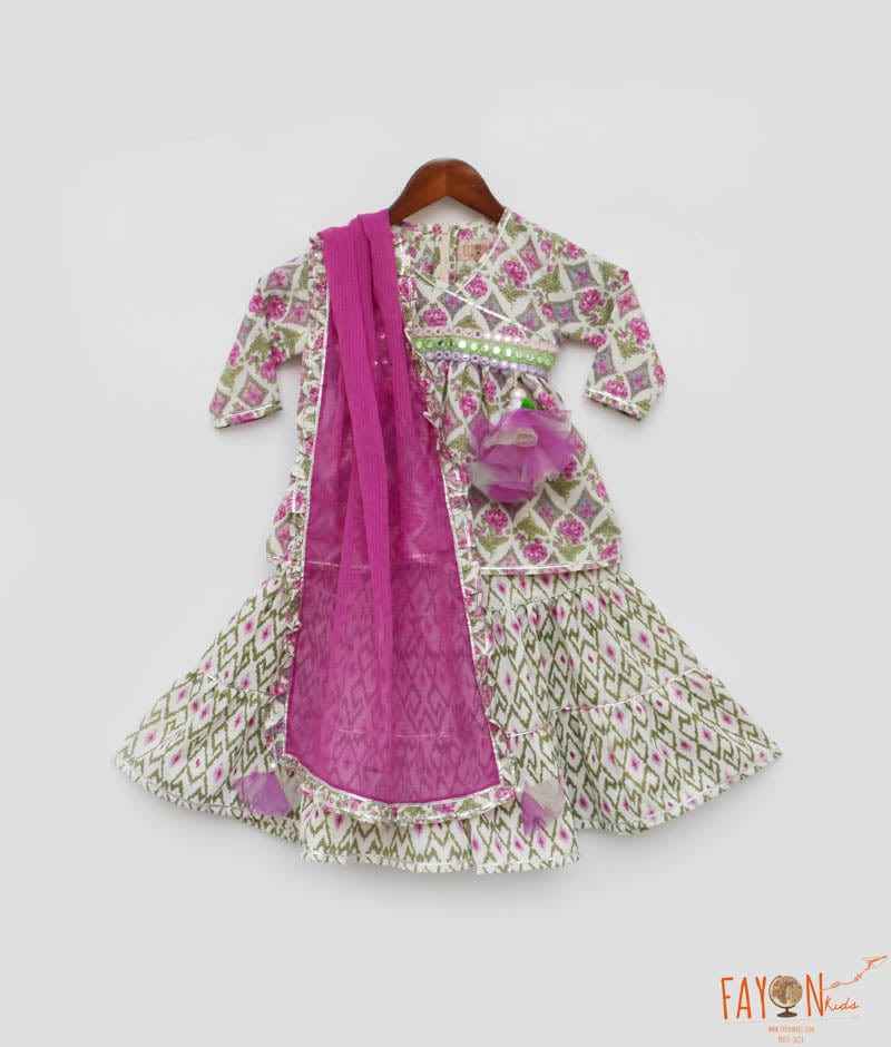 Nothing is fresher than the colour lilac! Fayon brings you a splash of freshness in our cotton printed off white and lilac Sharara Set. From a beautiful neckline to 3/4th sleeves and a mirror finishing on waist line is an absolute stunner.