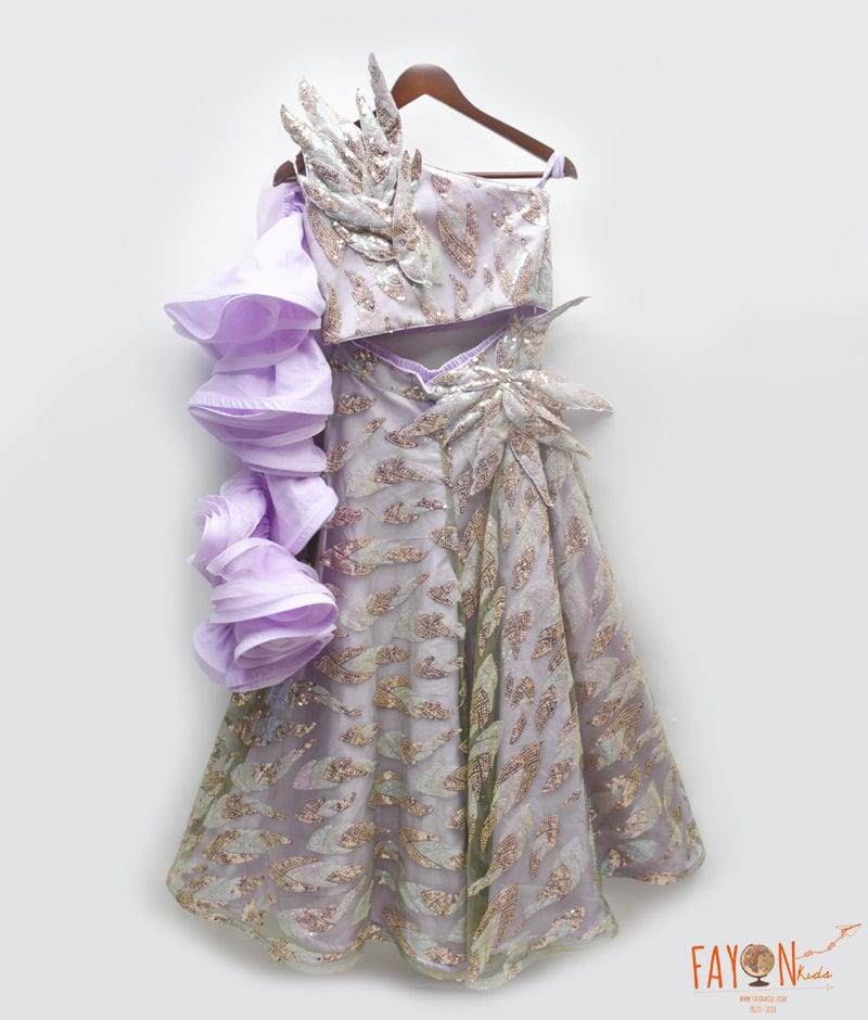 Dress your little one in elegance with our Lilac Sequence Embroidered Jumpsuit. This statement piece features 3D Cutwork Embroidery, culotte pants, and a chic one-shoulder style. The attached drape dupatta, adorned with butterflies and furs on the yoke, adds a touch of whimsy. Style this ensemble with delicate accessories and flats to create a look that's both sophisticated and playfulβa truly enchanting outfit for any special occasion.