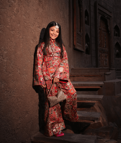 Elevate your little one's winter wedding attire with our multi-coloured embroidered jacket with pants - a perfect ensemble that keeps them stylish and warm. The thread and sequence embroidered jacket with soft lining, bell sleeves, and embroidered belt perfectly complement the embroidered bell bottom pants. This outfit not only adds a touch of elegance but also ensures your child stays cozy during the winter festivities. It's the ideal choice for a winter wedding, providing both style and comfort for your little fashionista.