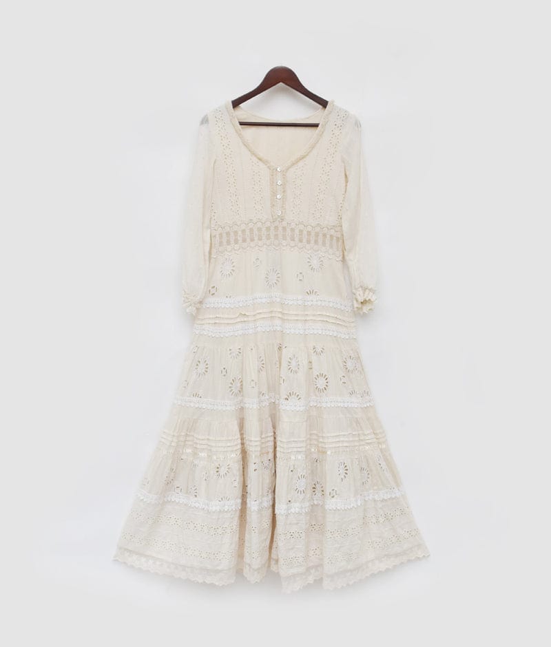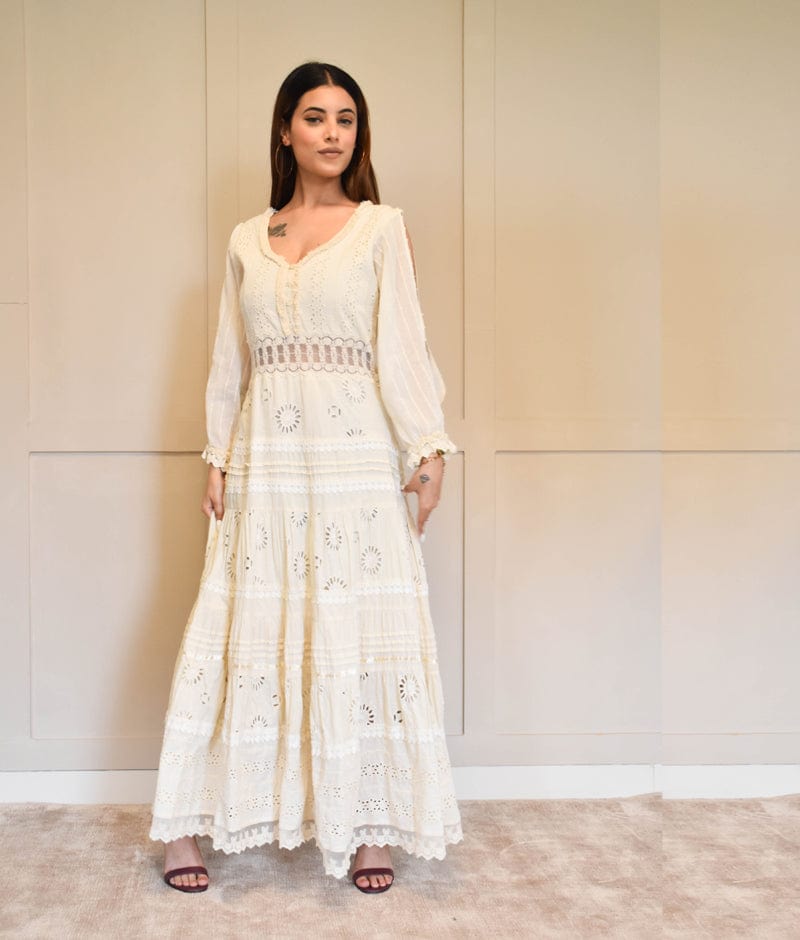 Introducing our Ladies Off-White Dress, made from premium cotton chikan fabric with a comfortable cotton lining, full sleeves, and delicate lace finishing. This dress offers a regular fit and is perfect for adding a touch of elegance to your wardrobe.