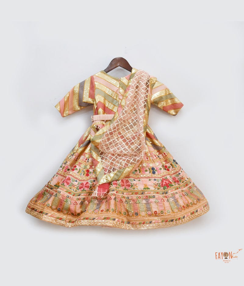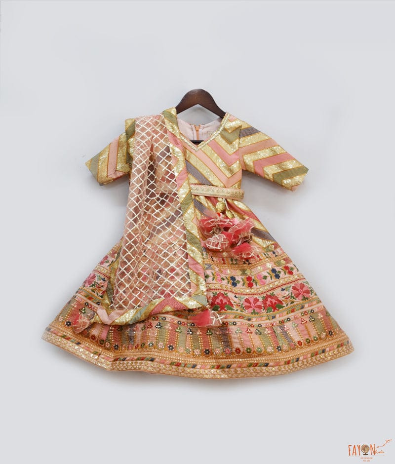 Soft divinity of pastel hues of Peach Embroidery Anarkali set makes the perfect festive outfit for the little princess. The flared Anarkali is made of 100% cotton lining, it has full sleeves with lining, round neck with zip at the back for ease of wear, with plain net dupatta with frill all over and glitter lace attached on one side of the shoulder, it has handmade tassels attached at the waist, gota work has been done all over the Anarkali.