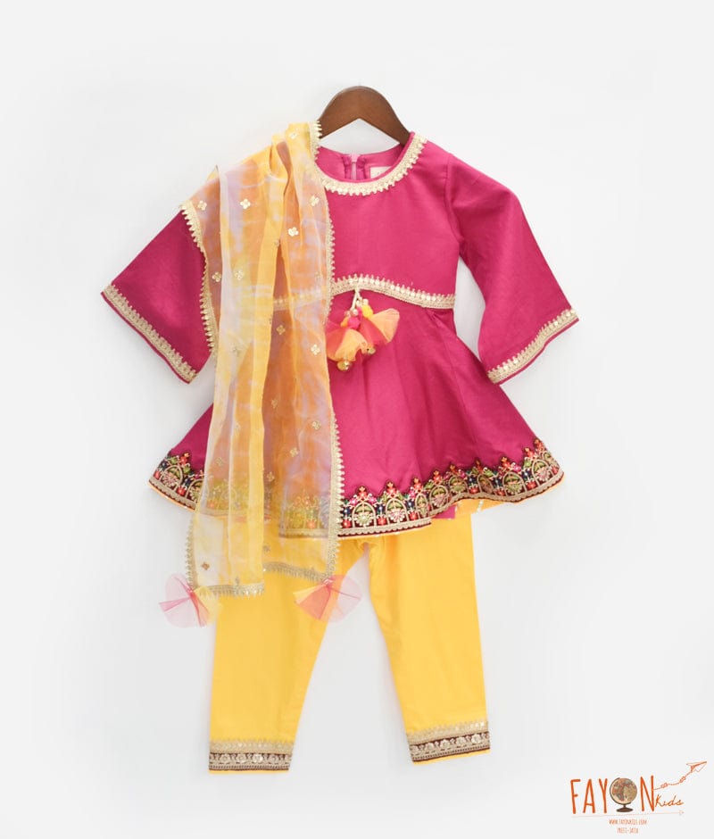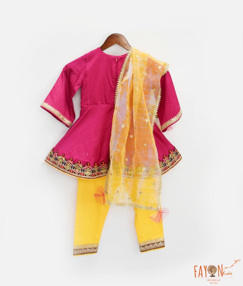 Dress your little girl in our Pink Kurti with Yellow Salwar, a delightful ensemble perfect for festive occasions. The pink cotton silk kurti offers a comfortable and luxurious feel, complemented by a soft lining for added comfort. The golden finishing lace adds a touch of elegance, beautifully adorning the suit and pant. Completing the look with the printed organza dupatta, featuring golden finishing and hand-made tassels. Let her shine in this charming outfit, radiating style and grace wherever she goes.