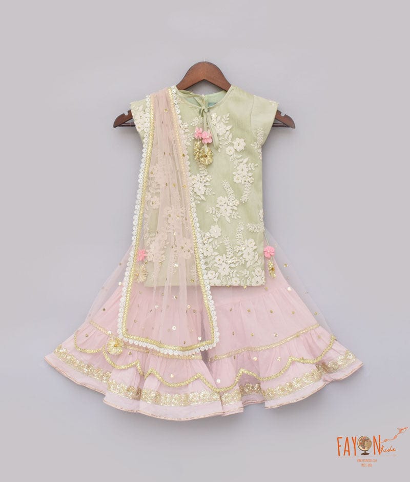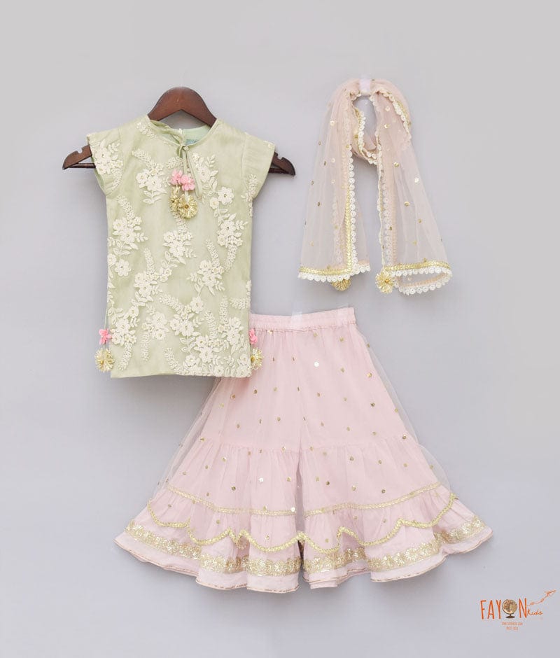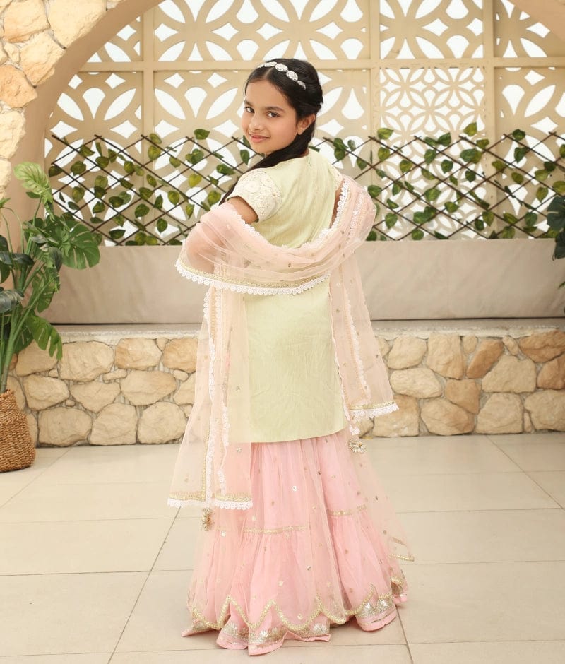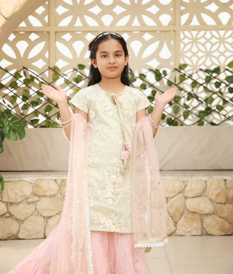 Pista Green Embroidery Pink Boti Net Sharara with Kurti Boti Net Dupatta for Girls