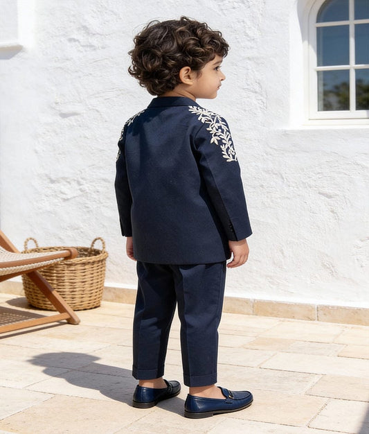 Crafted from premium suiting fabric, this dark blue bandgala and pant set is designed for comfort and style. It’s a versatile addition to your child’s wardrobe, suitable for various occasions.
