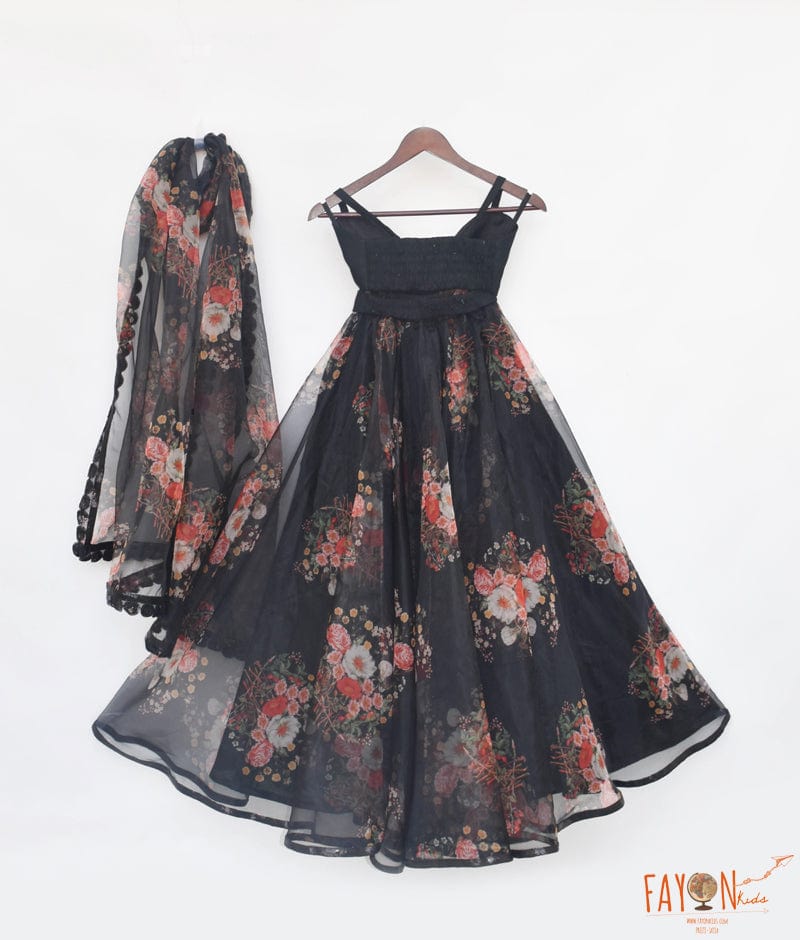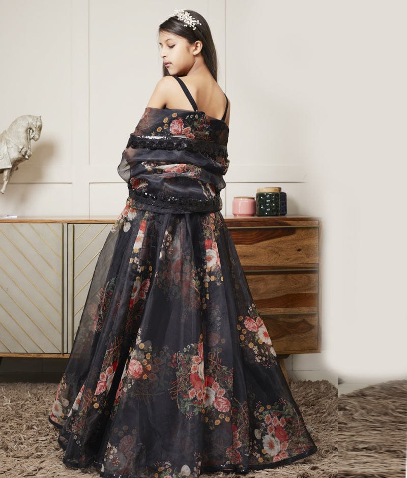 Every girl needs to have their favourites in their wardrobe, get hold of this beautiful black crop top with black organza lehenga with dupatta, back open. Get this beautiful contrast of floral black.