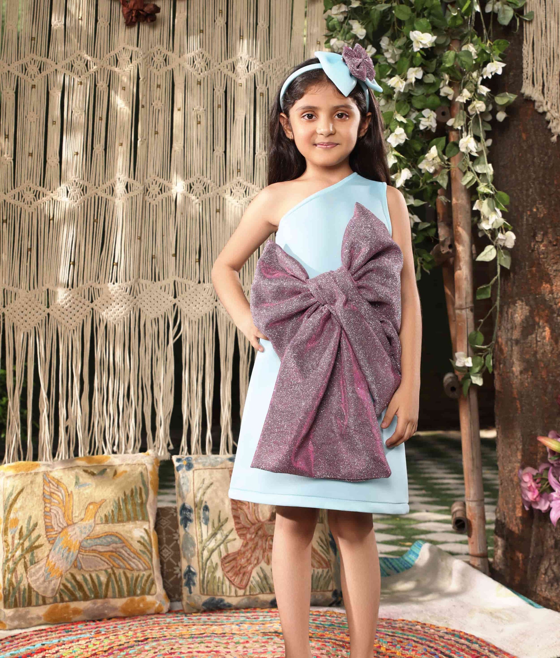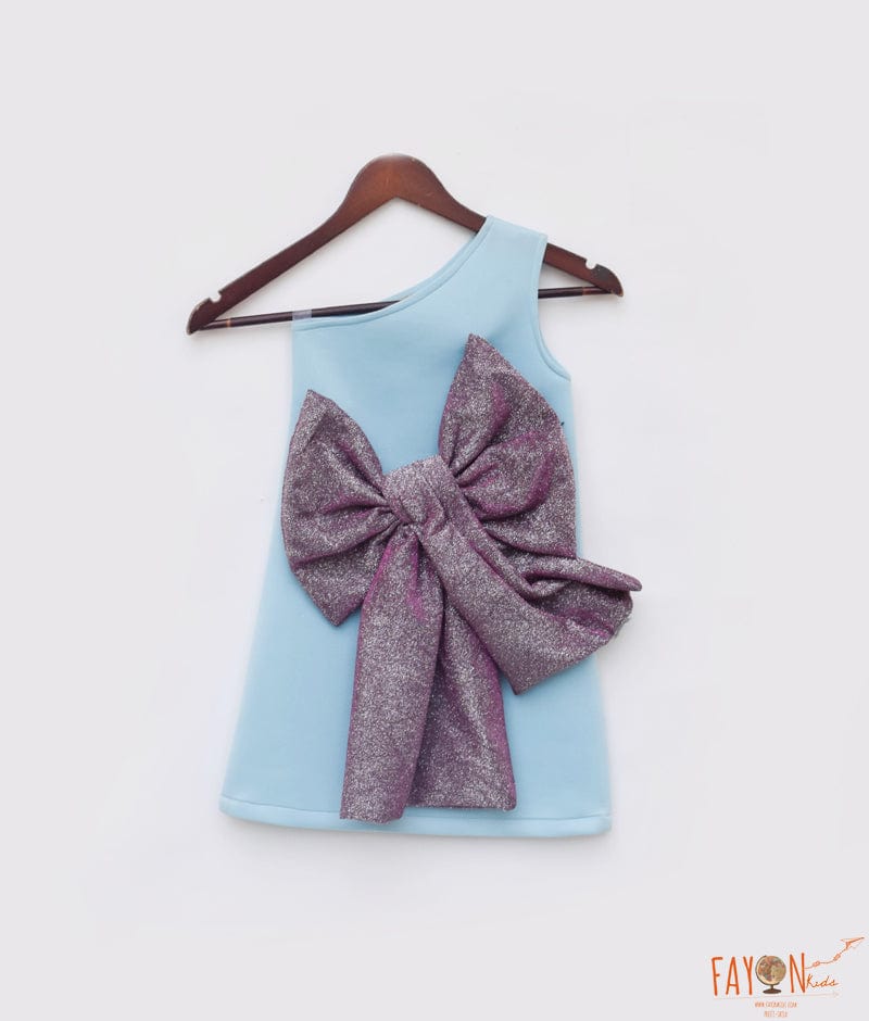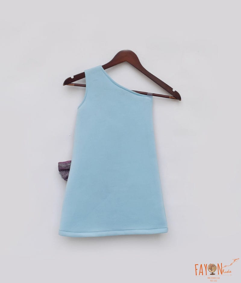 Step into the spotlight with our Blue Lycra Dress with Purple Shimmer Bow. This mesmerizing dress is made from premium blue lycra fabric, offering a comfortable and flattering fit. With its one-shoulder style, it exudes a contemporary and chic vibe. The dress is beautifully adorned with a dazzling purple shimmer bow, delicately attached at the waistline, creating an eye-catching focal point.